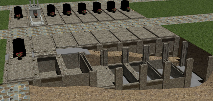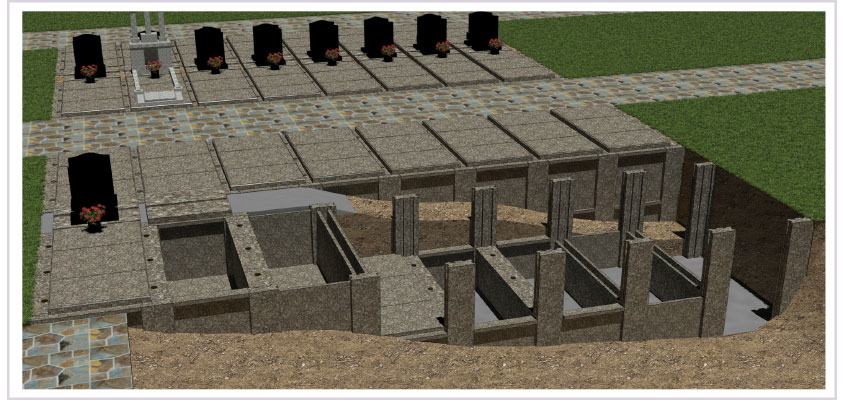 – Greenbridge Designs have developed a range of LACO compliant burial vaults manufactured from ‘over-engineered’ reinforced concrete in order to guarantee their structural integrity for the lifetime of the grave. These high quality pre-cast graves are available for one or two interments. The two interment option has internal dimensions of (minimum) – length 2200mm (86.5”) x width 850mm (34”) x height 650mm (26”). A range of granite and Glass Reinforced Concrete (GRC) memorials are available. Options also exist which incorporate integral DDA compliant pathways as part of the vault, saving space and creating a maintenance free solution.